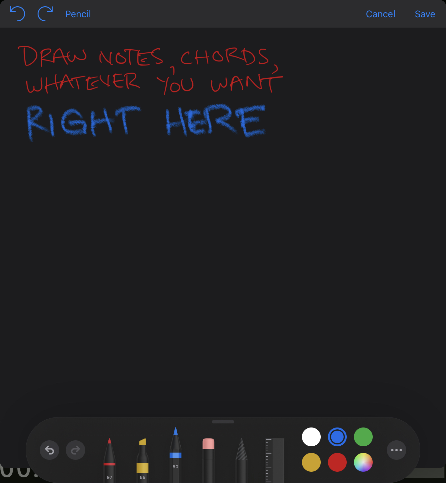 Second, you can now add hand-drawn attachments to songs using Apple Pencil or your finger. (iOS 13 or higher required.) See the new page in the manual for details.